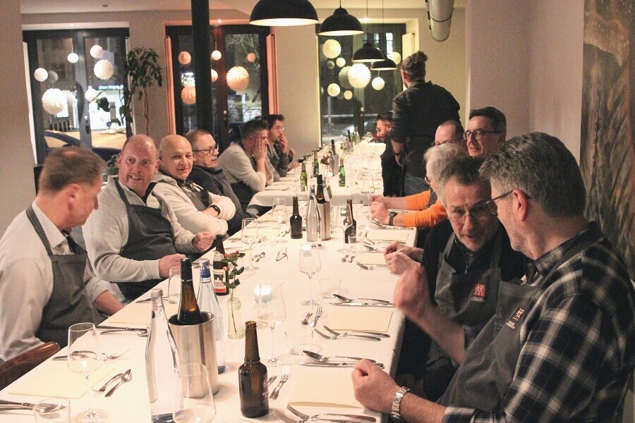 In der Kochschule angekommen wurden wir mit einem freundlichen Sektempfang begrüßt. Für diejenigen unter uns, die Spaß am Kochen haben, war dies eine großartige Chance, sich am Herd auszuprobieren. Mit Schürzen ausgerüstet bereiteten wir gemeinsam in einer voll ausgestatteten Küche ein 3-Gänge-Menü zu: Es gab Ziegenkäse-Brûlée, Entenbrust in Honigglasur und zum Abschluss einen Waldbeer-Cheesecake.
